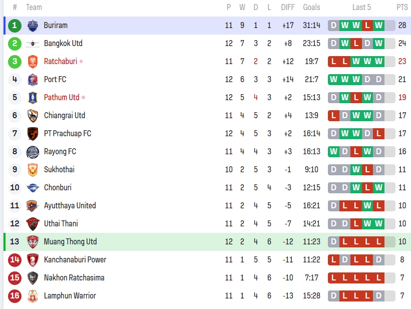 หลังโดนถล่ม 0-5 เมืองทองยังคง รั้งอันดับ 13 มี 10 คะแนน ฟอร์มช่วงหลังแพ้ติดกันยาวเป็นหางว่าว