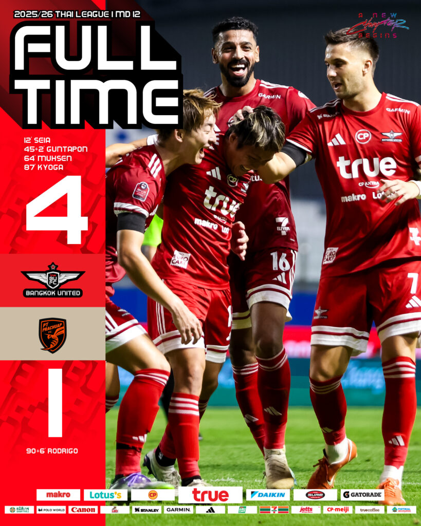 ชัยชนะ 4-1 ของ ทรู แบงค็อก ยูไนเต็ด เหนือ พีที ประจวบ เอฟซี ในศึก บีวายดี ซีไลออน ซิกส์ ลีกหนึ่ง 2025/26 นัดที่ 12 คือสัญญาณชัดเจนว่า “แข้งเทพ” กำลังยืนระยะได้อย่างแข็งกร้าว เกมรุกคม จังหวะเข้าทำเฉียบ และกดดันคู่แข่งได้ตลอด 90 นาที ทว่าแม้สกอร์ไหลลื่น ทีมยังรักษามาตรฐานเดิม—หิวแต้มและหิวความสมบูรณ์แบบ