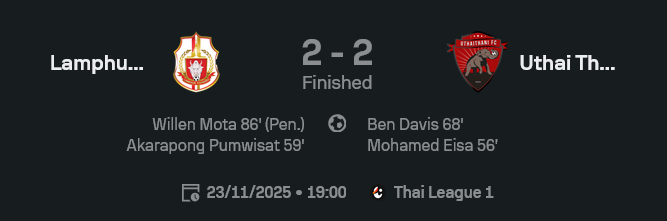 ศึก BYD SEALION 6 ลีกหนึ่ง 2025/26 คู่นี้บอกเลยรสชาติบอลหนีตายครบเครื่อง ทั้งเปลี่ยนเกม ทั้งดราม่าจุดโทษท้ายเกม สุดท้าย ลำพูน วอริเออร์ เปิดบ้านไล่ตีเสมอ อุทัยธานี เอฟซี 2-2 แบ่งกันไปฝั่งละแต้ม ในเกมที่รูปเกมและตัวเลขบนหน้าจอ ผลบอลสด ชี้ชัดว่าลำพูนบุกใส่ยับ แต่เกือบโดนทีมเยือนบันดาลแผลลึกกลับบ้าน