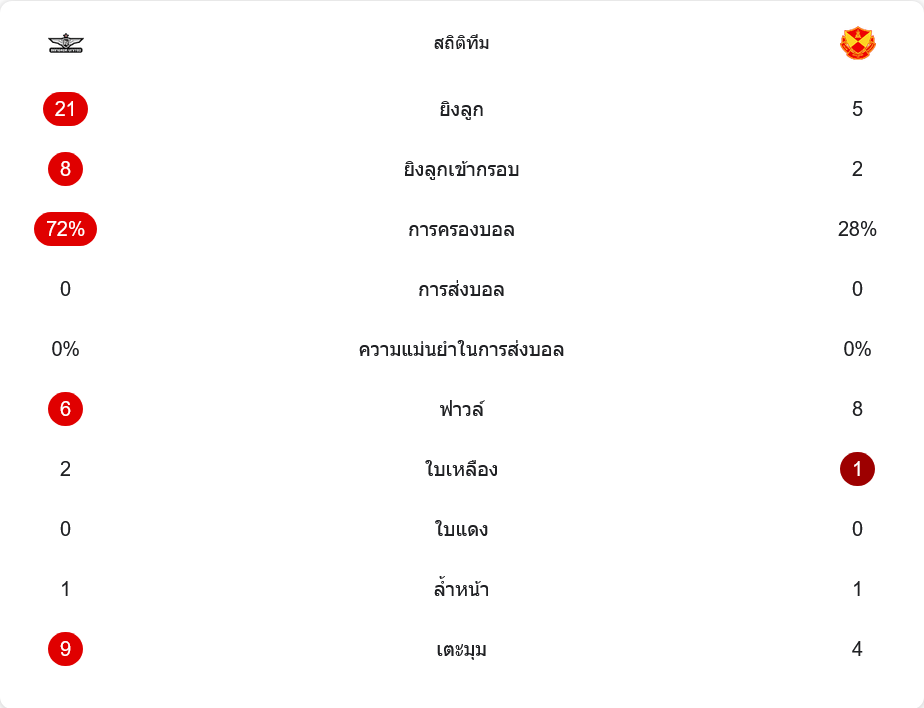 - ทรู แบงค็อก ยูไนเต็ด ยิงทั้งหมด 21 ครั้ง เข้าเป้า 8 ขณะที่เซลังกอร์ยิงแค่ 5 เข้ากรอบ 2
