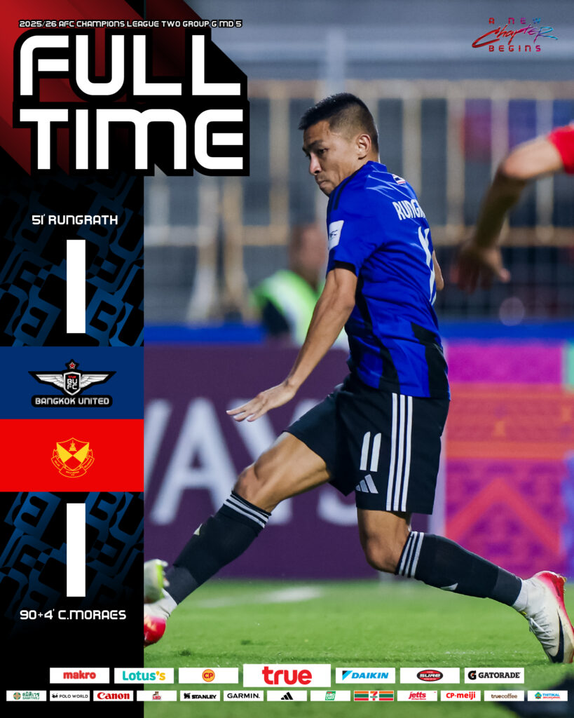 หลังปิดฉากภารกิจเอเชียชั่วคราว ทรู แบงค็อก ยูไนเต็ด จะกลับมาโฟกัสในเวทีภายในประเทศ ด้วยการยกพลบุกเยือน สุโขทัย เอฟซี ในเกมลีกวันอาทิตย์ที่ 30 พฤศจิกายน 2568 คิกออฟเวลา 18.00 น. ถ่ายทอดสดทาง AIS PLAY