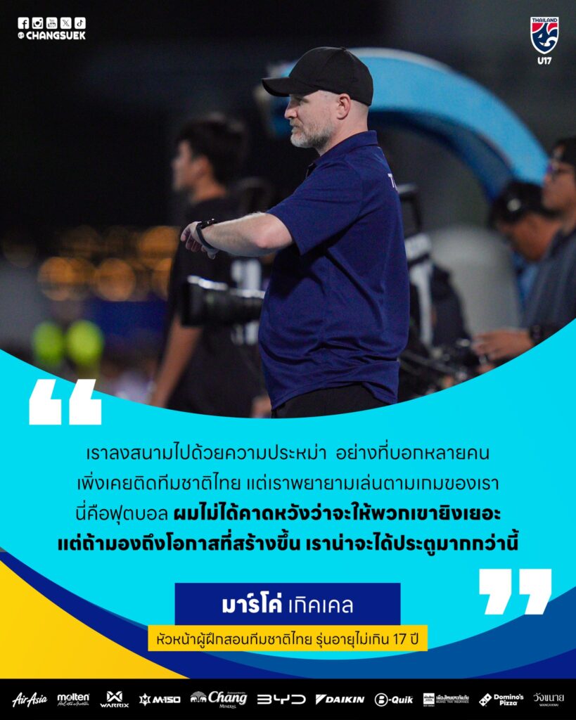 กุนซือชาวเยอรมันยอมรับแบบไม่ปิดบังว่า การเริ่มเกมในนัดนี้ “ไม่ง่าย” หลายคนลงสนามพร้อมความตื่นเต้น ทำให้รูปเกมช่วงแรกสะดุด ใช้เวลาเซตตัวนาน และเสียเวลาจากจังหวะเล็ก ๆ น้อย ๆ ที่ไม่น่าจะเกิดขึ้นในระดับนี้ แต่สุดท้ายด้วยคุณภาพและความมุ่งมั่นของแข้งไทย ทำให้ทีมคว้าชัยสองนัดติดต่อกัน และยังเดินหน้าตามเป้าหมายในเส้นทาง ชิงแชมป์เอเชีย รุ่น U17