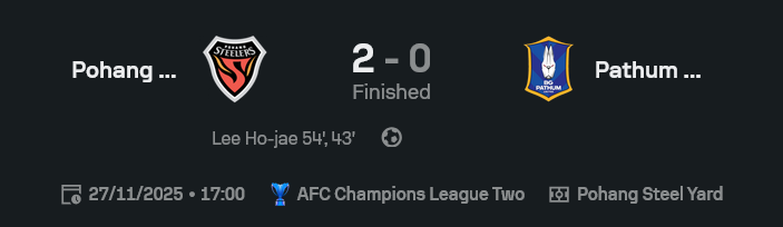 GOALSIAM ขอสรุปให้สั้น ๆ เกม เอเอฟซี แชมเปี้ยนส์ลีก อีลิท ทู 2025/26 คู่นี้ว่าเป็นค่ำคืนที่ ผลบอล ไม่เข้าข้างแฟนบีจีแบบสุดทาง โปฮัง สตีลเลอร์ส เปิดบ้านไล่บดตั้งแต่ต้นจนจบ ก่อนอาศัยความคมของ ลี โฮ-แจ ยิงคนเดียวสองดอก ชนะ บีจี ปทุม ยูไนเต็ด 2-0 พร้อมกดเจ้าตัวขึ้นหิ้งฮีโร่ประจำค่ำคืนไปเลย ⚽🔥