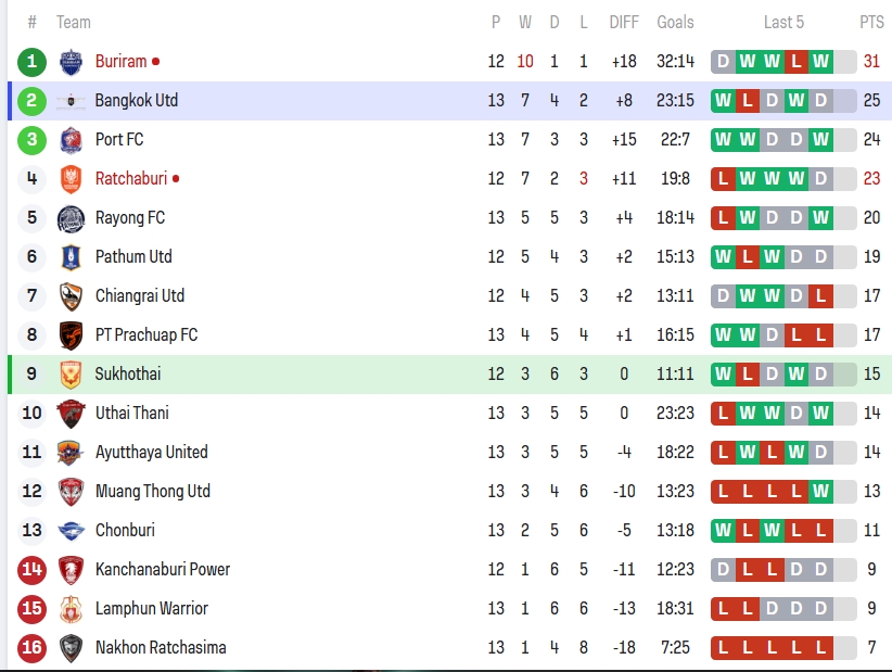 ด้านสุโขทัยมี 15 คะแนน อยู่กลางตารางอันดับ 9 แบบไม่เครียดมาก แต่ก็ยังต้องระวังหลัง เพราะพื้นที่ตกชั้นห่างไม่ไกลเท่าไร