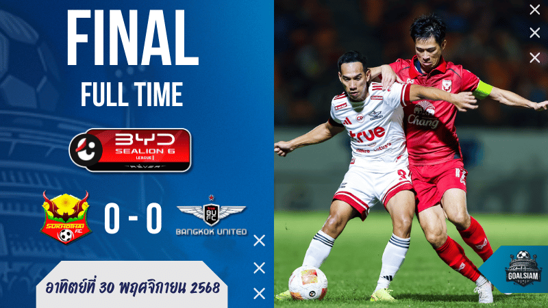 ศึก ไทยลีก 1 วันที่ 30 พฤศจิกายน 2568 “ค้างคาวไฟ” สุโขทัย เอฟซี เปิดบ้านรับมือ “แข้งเทพ” ทรู แบงค็อก ยูไนเต็ด แบบที่แฟนบอลต้องคอยลุ้นทุกลมหายใจ แม้สกอร์จะลงเอยด้วย 0-0 แต่รูปเกมไม่ได้เงียบอย่างผลสกอร์เลยสักนิด เพราะทั้งสองฝ่ายเปิดหน้าบู๊ใส่กันแบบไม่เกรงใจแดด อัดใส่เต็มเหยียดตั้งแต่นาทีแรกยันนาทีสุดท้าย เหมือนนัดกันมาว่าคืนนี้ “ใครยิงไม่ได้ ฉันก็ไม่ยอมโดนยิงเหมือนกัน!”