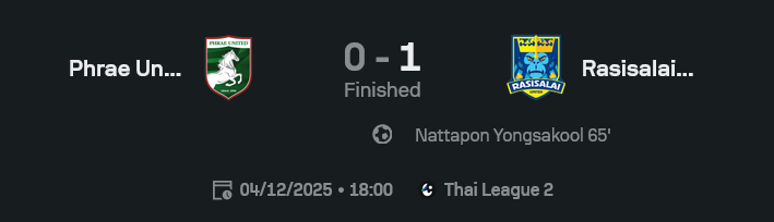 เกมนี้ในศึกไทยลีก 2 2025/26 แพร่ ยูไนเต็ด เปิดบ้านครองบอลเป็นว่าเล่น แต่สุดท้ายโดน ราศีไศล ยูไนเต็ด แทงทีเดียวจอด แพ้คาบ้าน 0-1 จากประตูโคตรคมของ นัฐพล ยงสกุล นาที 65 ตามหน้า ผลบอลสด บอกเลยว่าคนเชียร์เจ้าบ้านมีของขึ้น ส่วนแฟนทีมเยือนยิ้มกลับบ้านแบบหล่อๆ