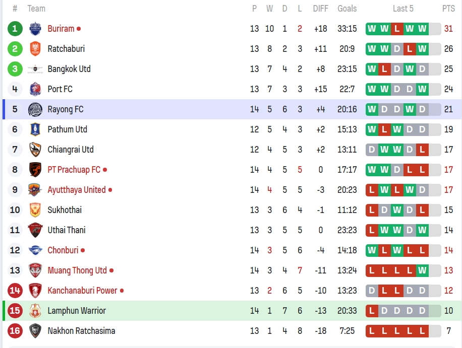 ในตาราง ไทยลีก ตอนนี้ ระยอง เอฟซี ขึ้นไปมี 21 คะแนน จาก 14 นัด รั้งอันดับ 5 ฟอร์ม 5 เกมหลัง “เขียวสะดุดนิดหน่อยแต่ไม่ร่วง” ชนะ-เสมอสลับไปมาแต่ยังยืนในโซนบนได้สบาย