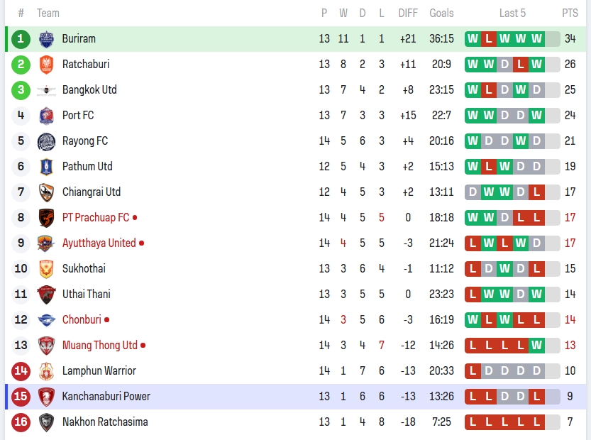 “ปราสาทสายฟ้า” บุรีรัมย์ ยูไนเต็ด ทิ้งห่างไปแบบไม่เห็นฝุ่น! ลงเล่น 13 นัด ชนะ 11 เสมอ 1 แพ้ 1 มี 34 แต้ม! ทิ้ง ราชบุรี ที่อยู่รองจ่าฝูงถึง 8 คะแนน! บอกเลยว่าถ้าไม่เกิดปาฏิหาริย์หรือฟอร์มตกแบบหาเหตุผลไม่ได้ แชมป์ ปีนี้คงไม่หนีไปไหนไกล นี่คือการยึดหัวหาด จ่าฝูง ที่โคตรแข็งแกร่ง!