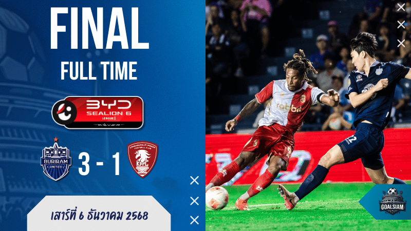 จะเอาอะไรไปสู้! บุรีรัมย์ ยูไนเต็ด โชว์ฟอร์มสมราคา จ่าฝูง ไทยลีก! แม้จะออกอาการ “อืด” ไปนาน แต่สุดท้ายก็อาศัยความเก๋าบวกคุณภาพนักเตะที่เหนือกว่า โกงความตายพลิกกลับมาเชือด กาญจนบุรี พาวเวอร์ (ที่โดนเรียก พลังกาญจน์ เอฟซี ในข่าว) ไปแบบสุดมันส์ 3-1 ในศึก BYD SEALION 6 ลีกหนึ่ง เมื่อคืนวันเสาร์ที่ 6 ธันวาคม 2568 เก็บสามแต้มสำคัญ หนีรองจ่าฝูง 8 แต้มไปแบบหายห่วง ส่วน “ม้าเหล็ก” ผู้มาเยือน สู้ได้ใจแต่สุดท้ายก็ต้านไม่ไหว ผลบอลสด นัดนี้ตอกย้ำช่องว่างของลีกได้อย่างเจ็บปวด