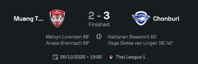 - นาที 88 เมลวิน ลอเรนเซน โฉบโหม่งจ่อๆ ให้เมืองทองไล่มา 2-3 ลุ้นเฮือกสุดท้ายแต่ไม่ทัน เสียงนกหวีดสุดท้ายช่วยเซฟชลบุรีเอาไว้