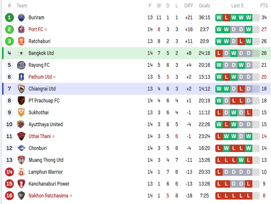 ส่วนเชียงราย ขยับเป็น 18 แต้มจาก 13 นัด รั้งอันดับ 7 ดูเผินๆ เหมือนกลางๆ แต่ฟอร์มระยะหลังถือว่าเหนียวแน่น แพ้ยาก ถ้ารักษามาตรฐานนี้ได้ มีสิทธิ์เบียดขึ้นบนได้อีก