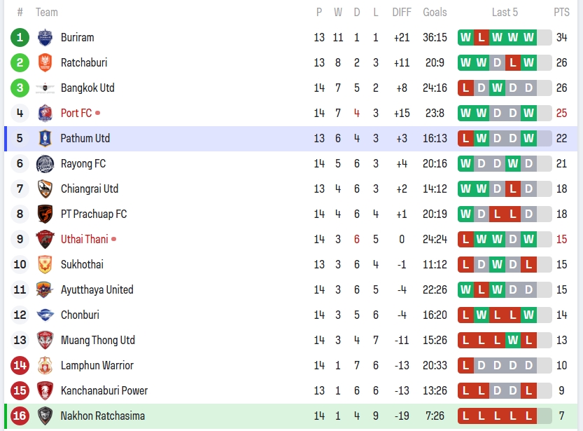 ในตารางลีกตอนนี้ นครราชสีมารั้งอันดับ 16 เตะ 14 นัด ชนะ 1 เสมอ 4 แพ้ 9 ยิงได้ 7 เสีย 26 ประตู ผลงาน 5 นัดหลังในลีกแพ้รวดทั้งหมด ฟอร์มแบบนี้บอกตรง ๆ ว่าอยู่ในโหมดหนีตกชั้นเต็มตัว ต้องเร่งเก็บแต้มให้เร็วที่สุด ไม่อย่างนั้นอาจหล่นจากลีกสูงสุดได้จริง