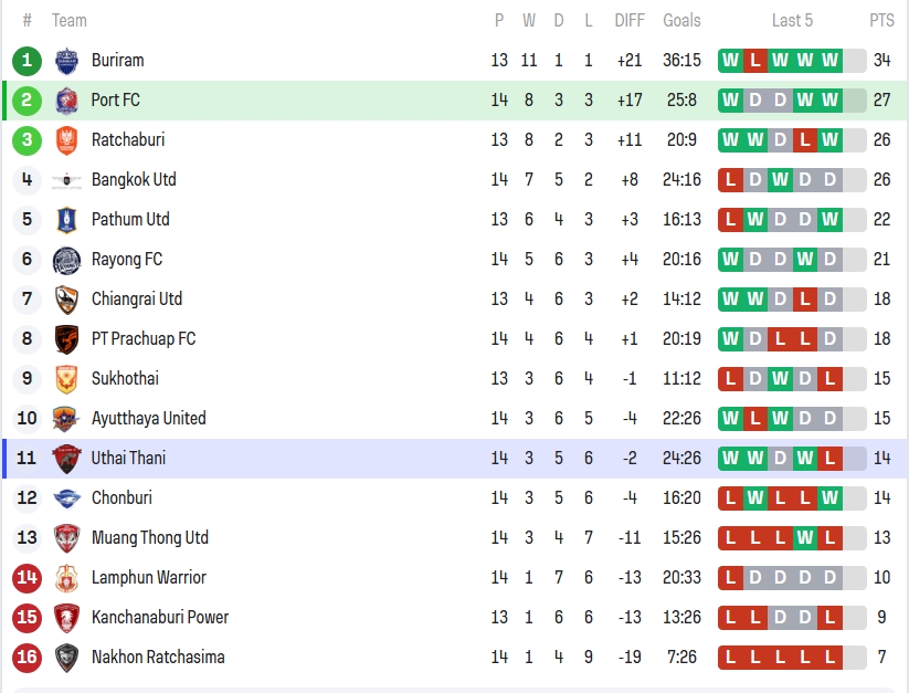 - การท่าเรือ เก็บเพิ่มเป็น 27 คะแนนจาก 14 นัด ลูกได้เสีย +17 ขยับขึ้นรั้งรองจ่าฝูงเต็มตัว กดดันผู้นำแบบมีลุ้นยาวๆ