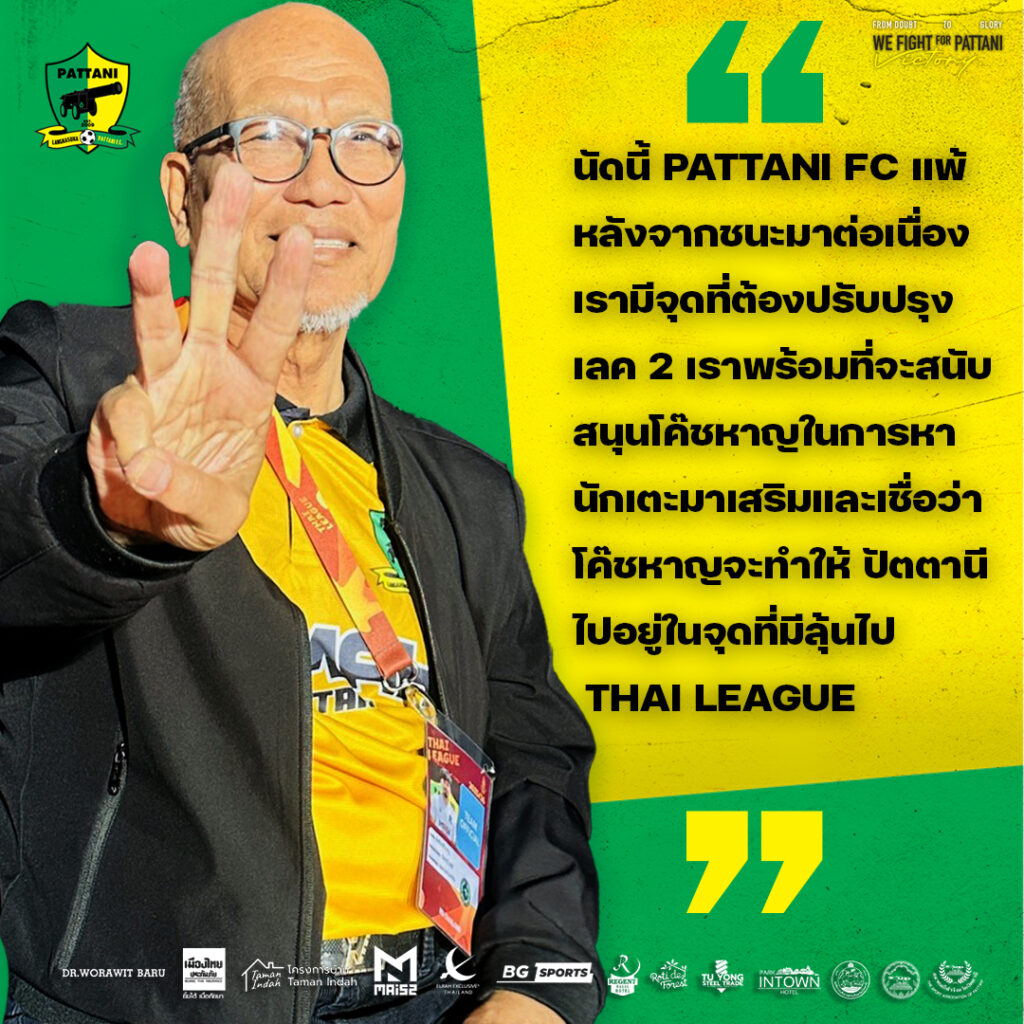 หลังจบเกม “ผศ.ดร.วรวิทย์ บารู” หรือ “อาจารย์มะ” ประธานสโมสรของทัพ “ปืนใหญ่พญาตานี” ออกมาให้สัมภาษณ์อย่างชัดเจนว่า ความพ่ายแพ้ในนัดนี้ไม่ได้ทำให้สโมสรไขว้เขว กลับกันยิ่งตอกย้ำว่า บอร์ดบริหารพร้อมหนุน โค้ชหาญ ทำทีมต่อไปในระยะยาว