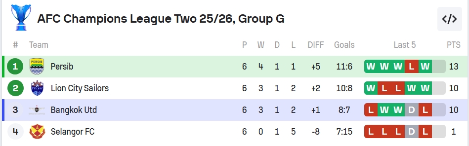 - Lion City Sailors แข่ง 6 ได้ 10 แต้ม เช่นเดียวกับ ทรู แบงค็อก ยูไนเต็ด ที่มี 3 ชนะ 1 เสมอ 2 แพ้ 1 ได้ 8 เสีย 7 ผลต่าง +1