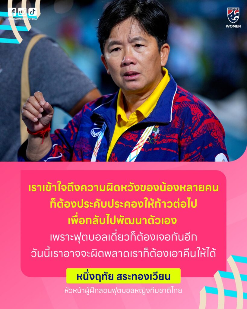 โค้ชหนึ่งยังไม่ลืมฝากถึงแฟนบอล ขอให้ช่วยเป็นกำลังใจให้นักเตะต่อไป แม้ครั้งนี้อาจทำให้หลายคนรู้สึกผิดหวัง แต่ทีมงานและนักเตะเองก็เจ็บไม่แพ้กัน และจะพยายามใช้เกมชิงที่ 3 เป็นเวทีพิสูจน์ให้เห็นถึงความมุ่งมั่นของทีมชาติไทยหญิงอีกครั้ง
