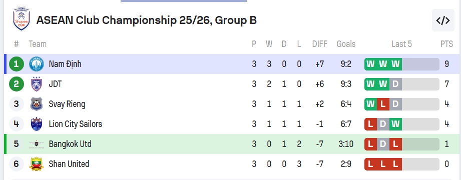 หลังจบเกมนี้ ชิงแชมป์สโมสรอาเซียน Shopee Cup กลุ่ม B หน้าเสื่อเปลี่ยนทันที นัม ดินห์ เอฟซี เก็บ 9 แต้มเต็มจาก 3 นัด ประตูได้เสีย 9-2 นั่งจ่าฝูงสบายๆ ฟอร์มระดับนี้ต้องบอกว่าโอกาสเข้ารอบต่อไปสดใสแบบไฟนีออนไม่ต้องเปิดก็เห็น ส่วน ทรู แบงค็อก ยูไนเต็ด มีแค่ 1 แต้มจาก 3 นัด ประตูได้เสีย 3-10 รั้งอันดับ 5 ของกลุ่ม โดนทั้ง JDT, Svay Rieng และ Lion City Sailors ทิ้งห่างไปเรียบร้อย เส้นทางเข้ารอบต้องลุ้นยาวแบบไม่ผิดพลาดอีกแล้ว