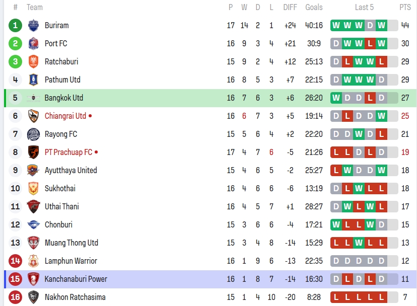 ด้านกาญจนบุรี พาวเวอร์ เอฟซี เล่นไป 16 นัด มี 11 คะแนนเท่าเดิม สถิติชนะ 1 เสมอ 8 แพ้ 7 ลูกได้เสีย 16:30 ยืนอยู่ที่อันดับ 15 หรือรองบ๊วยของลีก ฟอร์ม 5 นัดหลังเสมอเป็นหลัก D L D D D ซึ่งแม้จะไม่แพ้บ่อย แต่การเก็บสามแต้มไม่ได้เลยก็เสี่ยงสูงที่จะถูกดูดลงไปจมท้ายตาราง ถ้าไม่เร่งแก้เกมรุกให้คมกว่านี้