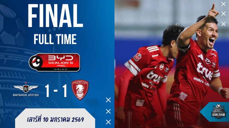 ในค่ำคืนที่แฟนบอลรอจะเห็น ผลบอลสด จากทรู บีจี สเตเดียมเป็นสามแต้มของ “แข้งเทพ” ทรู แบงค็อก ยูไนเต็ด กลับกลายเป็นดราม่าจบไม่สวย เมื่อเปิดบ้านโดน “ม้าเหล็ก” กาญจนบุรี พาวเวอร์ เอฟซี บุกนำก่อนตั้งแต่ครึ่งแรก ก่อนใช้ความดุเดือดบุกแทบจะฝ่ายเดียวแต่เจาะเพิ่มไม่ได้ จบ 90 นาทีแบ่งแต้ม 1-1 ในศึก BYD SEALION 6 ลีกหนึ่ง ฤดูกาล 2025/26 ทำให้ทีมอันดับ 5 จากเมืองหลวงสะดุดไร้ชัยในลีก 4 นัดติด ส่วนทีมเยือนที่เหลือ 10 คนตั้งแต่นาที 83 ยังหอบหนึ่งแต้มกลับบ้านแบบสุดคุ้มในเวที ไทยลีก ระดับท็อปของประเทศ