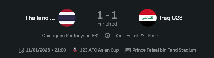 - นาที 25 อิรักได้จุดโทษ จากจังหวะ ไอเมน ลูเอย์ ลากตัดเข้าเขตโทษแล้วโดนชนล้ม ผู้ตัดสินชี้จุดโทษทันที พร้อมเสียงบ่นจากแฟนไทยทั้งโซเชียล