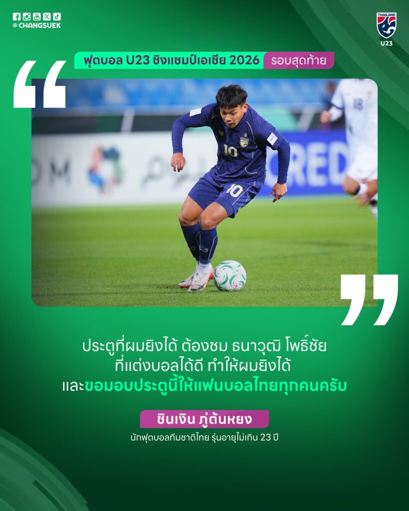 ชินเงิน ภู่ตันหยง” แนวรุกของ “ทีมชาติไทย รุ่นอายุไม่เกิน 23 ปี” ออกมาเปิดใจหลังเกมที่ทัพช้างศึกยู-23 เสมอ “อิรัก” 1-1 ในศึกฟุตบอล U23 ชิงแชมป์เอเชีย 2026 รอบแบ่งกลุ่ม กลุ่ม D นัดที่ 2 เมื่อวันที่ 11 ม.ค. ที่ผ่านมา ณ ประเทศซาอุดีอาระเบีย