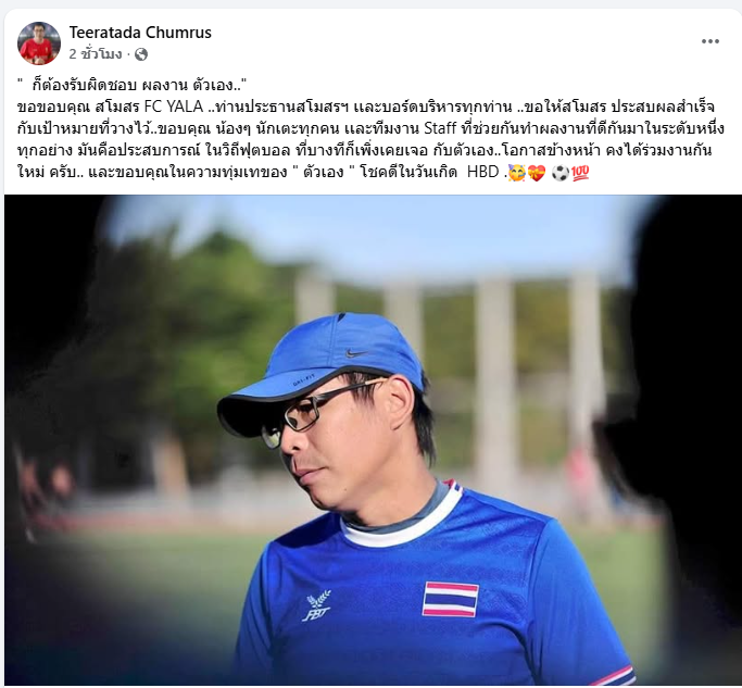 และแม้จะอำลา แต่เขาทิ้งท้ายด้วยน้ำเสียงที่เปิดประตูอนาคตไว้ว่า “โอกาสข้างหน้า คงได้ร่วมงานกันใหม่” พร้อมขอบคุณความทุ่มเทของตัวเอง และยังอวยพรวันเกิดด้วยข้อความ “HBD” ที่ทำให้โพสต์นี้มีกลิ่นอายความอบอุ่นปนความจริงจังแบบคนทำงานฟุตบอลตัวจริง
