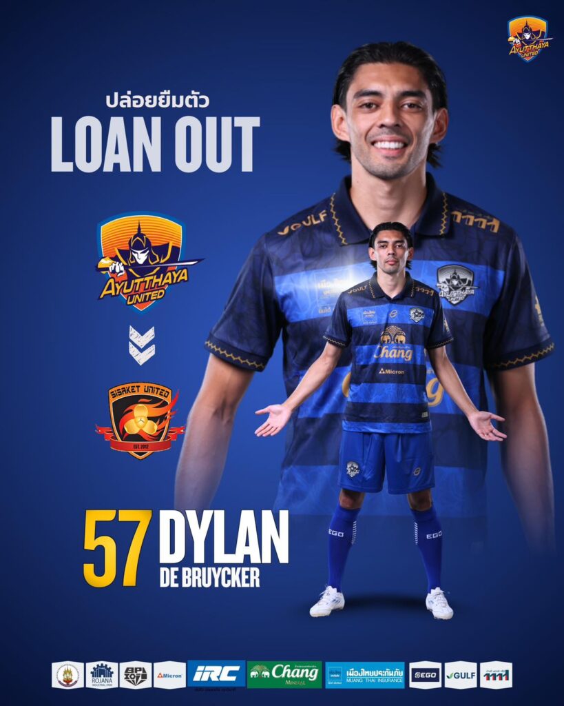 “อยุธยา ยูไนเต็ด” ทีมอันดับ 9 ของตารางฟุตบอล T1 ฤดูกาล 2025/26 หลังผ่าน 16 นัด ประกาศปล่อยยืม ดีแลน เดอ บรุ๊คเกอร์ กองกลางชาวฟิลิปปินส์-เบลเยียม ย้ายไปร่วมทีม ศรีสะเกษ ยูไนเต็ด สโมสรลีกรองในเลกสองเป็นที่เรียบร้อย
