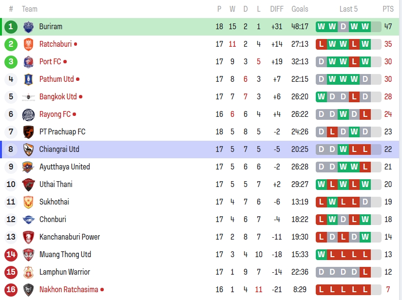 ส่วนเชียงรายหลังโดนถล่ม 8-1 หล่นไปอยู่ที่ 8 ของตาราง แข่ง 17 นัด มี 22 คะแนน ประตูได้เสีย -5 (ยิง 20 เสีย 25) และแพ้ในลีก 2 นัดติด ฟอร์มช่วงหลังออกอาการสะดุดชัดเจน ถ้าไม่รีบตั้งหลัก เกมลุ้นตั๋วโควต้าเอเชียมีสิทธิ์หลุดมือ