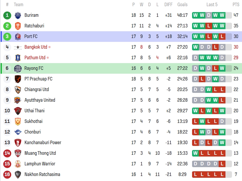 - การท่าเรือ เอฟซี แม้แพ้ยับ แต่ยังเกาะอันดับ 3 มี 30 แต้มจาก 17 นัด ประตูได้เสีย +18