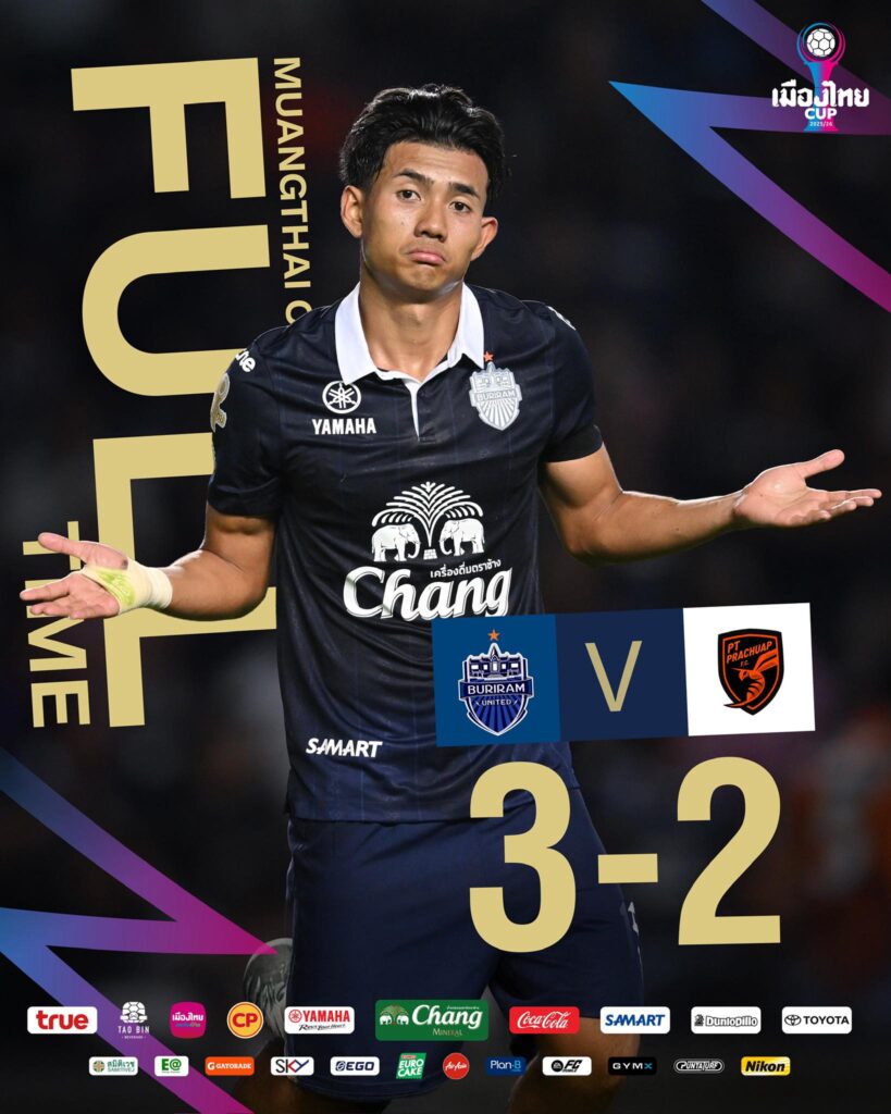 ศึกฟุตบอล เมืองไทย คัพ 2025/26 รอบ 16 ทีม ที่ ช้าง อารีนา จบลงด้วยภาพจำแบบแฟนบอลลุ้นปลายจอ เมื่อ บุรีรัมย์ ยูไนเต็ด เปิดบ้านเฉือน พีที ประจวบ เอฟซี 3-2 เก็บชัยชนะสำคัญ พร้อมการันตีตั๋วสู่ รอบ 8 ทีมสุดท้าย ได้ตามเป้าหมาย