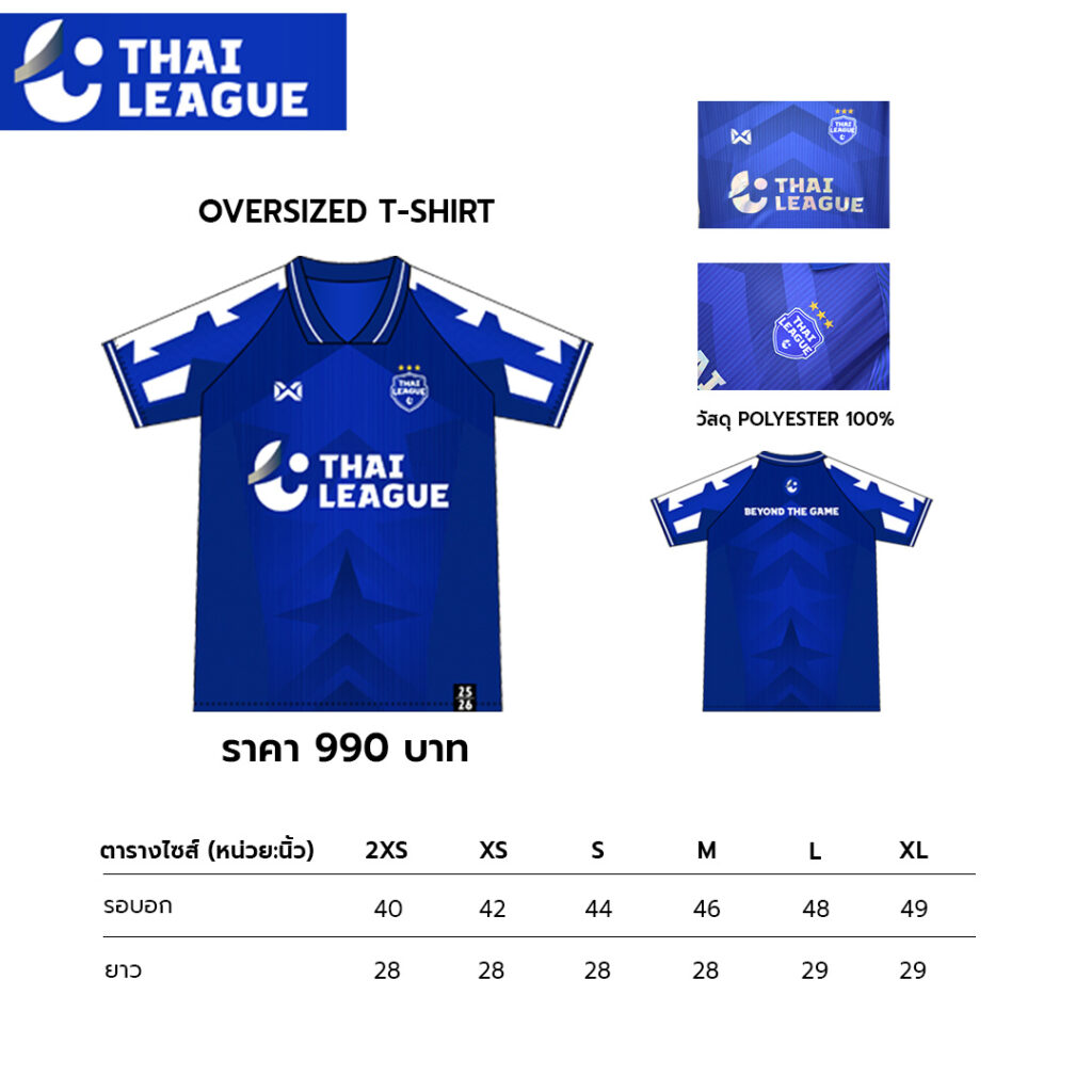 เสื้อฟุตบอล THAI LEAGUE – รุ่น BEYOND THE GAME เป็นไอเทมที่ออกแบบให้ใส่ได้จริง ทั้งเนื้อผ้านิ่มใส่สบายไม่ร้อน ดีไซน์เท่ ด้านหลังสกรีนคำว่า BEYOND THE GAME เหมาะทั้งใส่ถ่ายรูป ใส่เที่ยว และใส่เชียร์บอล ราคา 990 บาท ค่าส่ง 50 บาท และมีจำนวนจำกัด ใครอยากได้สามารถทักเพจ Thai League เพื่อสั่งซื้อได้โดยตรง