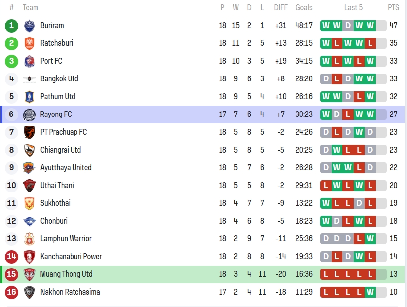 ขณะที่ เมืองทอง ยูไนเต็ด สถานการณ์เริ่มน่าเป็นห่วง จมอยู่อันดับ 15 แข่ง 18 นัด ชนะ 3 เสมอ 4 แพ้ถึง 11 ยิงได้ 16 เสีย 36 ผลต่าง -20 มีเพียง 13 คะแนน และที่น่าหนักกว่าสถิติคือฟอร์ม 5 นัดหลังสุดแพ้รวด 5 เกมเต็ม แฟนกิเลนที่เปิด ไทยลีก 1 ดูคงได้แต่ถอนหายใจยาวๆ ว่าปีนี้ต้องหนีตกชั้นกันให้สุดทาง