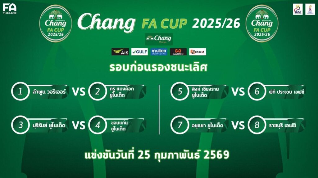 การแข่งขัน ช้าง เอฟเอ คัพ ฤดูกาล 2025/26 รอบ 8 ทีมสุดท้าย จะทำการแข่งขันในวันที่ 25 กุมภาพันธ์ 2569 และแฟนบอลไม่ต้องลุ้นให้เหนื่อย เพราะถ่ายทอดสดครบทุกคู่ผ่าน AIS PLAY และ Monomax ตามประกาศอย่างเป็นทางการ
