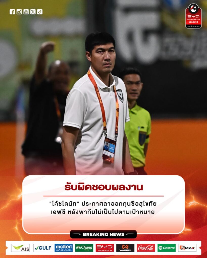 ⚡ประกาศชัดกลางกระแสกดดัน: “โค้ชโดนัท” ลาออกจากสุโขทัย เอฟซี