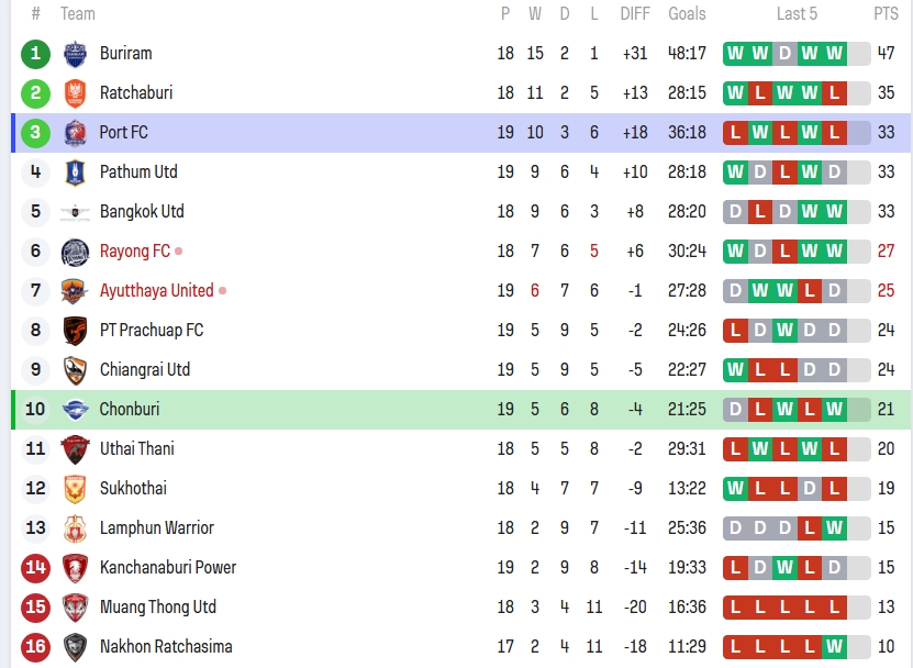 ด้านการท่าเรือ ยังรั้งอันดับ 3 มี 33 คะแนนจาก 19 นัด ผลต่างประตูได้เสียยังดีอยู่ที่ +18 ยิง 36 เสีย 18 แต่ฟอร์ม 5 นัดหลังหน้าเสื่อไม่ค่อยสวย “แพ้-ชนะ-แพ้-ชนะ-แพ้” แบบนี้ ถ้ายังแกว่งต่อ มีสิทธิโดนทีมข้างหลังอย่าง บีจี ปทุม หรือ แบงค็อก ยูไนเต็ด ไล่กวดทันในไม่ช้า