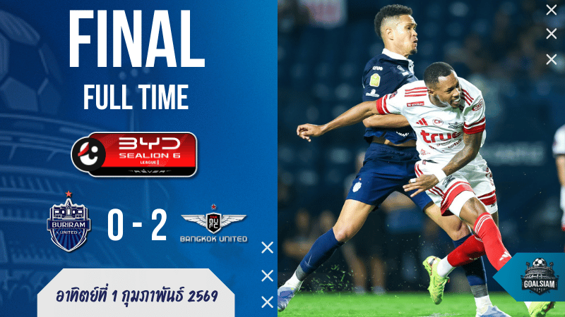ศึกฟุตบอล BYD SEALION 6 ลีกหนึ่ง ฤดูกาล 2025/26 คืนวันอาทิตย์ที่ 1 กุมภาพันธ์ 2569 ที่ช้าง อารีนา แฟนบอลถึงกับอึ้งเมื่อ บุรีรัมย์ ยูไนเต็ด จ่าฝูงที่กำลังวิ่งฉิว โดน ทรู แบงค็อก ยูไนเต็ด บุกมากดคนละหมัดต้นเกม-ท้ายเกม แพ้ 0-2 แบบเจ็บลึก ทั้งที่ครองบอลอยู่ฝ่ายเดียวแทบทั้งแมตช์ ผลนี้ทำให้ปราสาทสายฟ้าพ่ายเป็นนัดที่สองของซีซัน ส่วนแข้งเทพขยับขึ้นมาลุ้นพื้นที่หัวตารางเต็มตัว แฟนสายเช็ก ผลบอลสด เห็นสถิติจบเกมแล้วคงได้แต่บ่น “บอลมันไม่ได้แพ้ที่ตัวเลขจริงๆ”