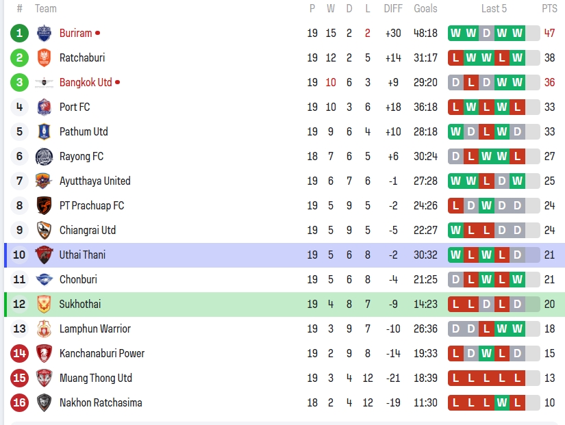 - สุโขทัย เอฟซี แข่ง 19 นัด มี 20 คะแนน ประตูได้เสีย -9 (14:23) อยู่ที่ 12 ฟอร์ม 5 เกมหลังสุด L-L-D-L-D แฟนค้างคาวไฟคงถอนหายใจยาวว่าดีแล้วที่ไม่แพ้ในบ้านอีก