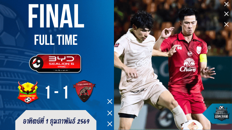 เกม ไทยลีก ค่ำคืนวันที่ 1 กุมภาพันธ์ 2569 สุโขทัย เอฟซี เปิดบ้านเจอกับ อุทัยธานี เอฟซี กลายเป็นบอลที่คนดูต้องลุ้นกันยันทดเจ็บ VAR ทำงานสองรอบ ทั้งยกเลิกประตูและให้จุดโทษ ทีมเยือนนำก่อนจาก บรูโน่ ไบอู แต่เจ้าถิ่นไม่ยอม โยนซูเปอร์ซับ ศิโรชน์ ฉัตรทอง ลงมากดตีเสมอ นาที 77 จบเกมเสมอ 1-1 แบ่งกันไปฝั่งละแต้มแบบมีหัวเสียปนหัวเราะ
