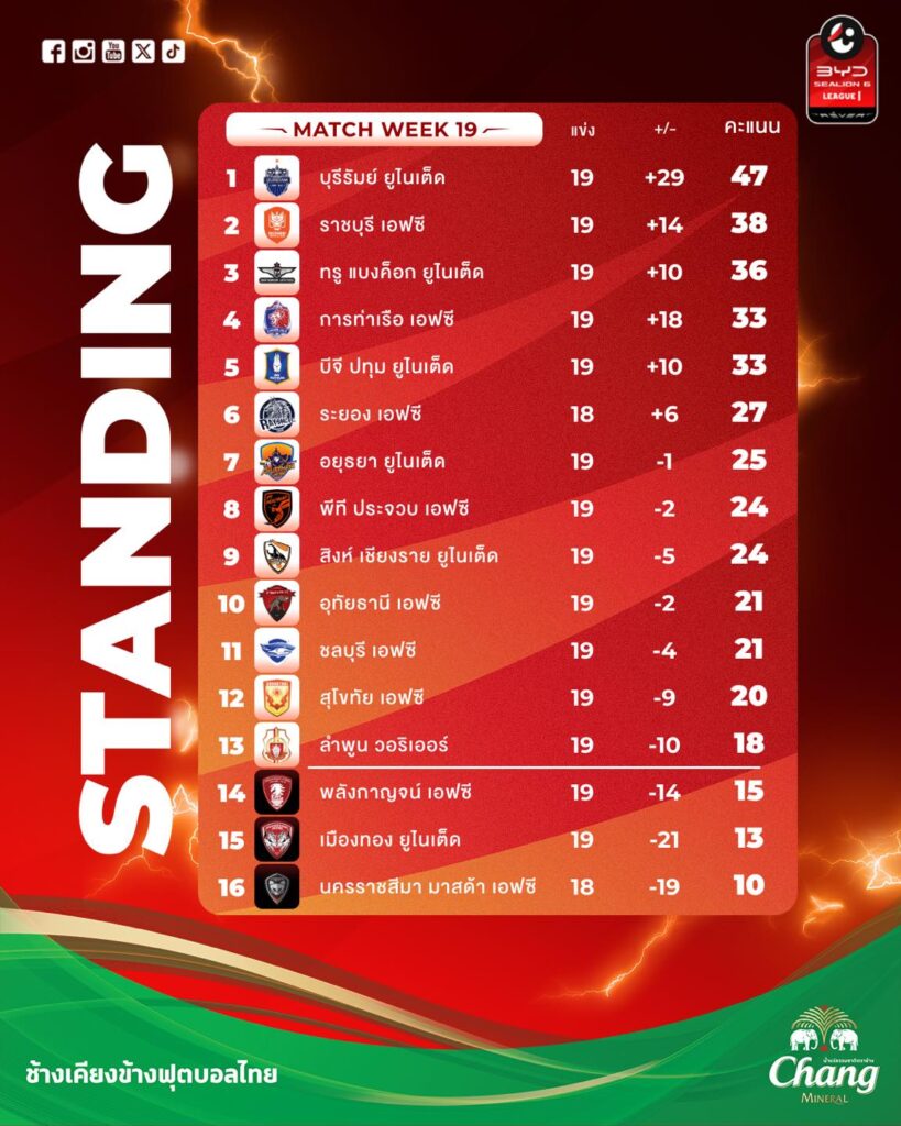 - อันดับ 1 บุรีรัมย์ ยูไนเต็ด — แข่ง 19 | ผลต่าง +29 | 47 แต้ม
