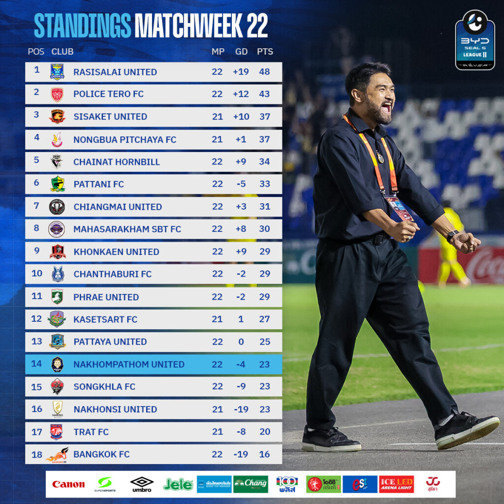 ก่อนหน้านี้ภาพของนครปฐมคือทีมที่ “จมโซนแดง” และถูกตั้งคำถามว่าจะเอาตัวรอดได้ไหมในฤดูกาลนี้ แต่หลังคว้าชัยเหนือจันทบุรี พวกเขาขยับขึ้นมาอยู่อันดับ 14 ได้สำเร็จ ลงเล่น 22 นัด เก็บ 23 คะแนน กลายเป็นทีมที่กลับเข้าสู่โซนปลอดภัยแบบเต็มตัว และที่สำคัญคือโมเมนตัมกำลังพุ่งขึ้นเรื่อยๆ