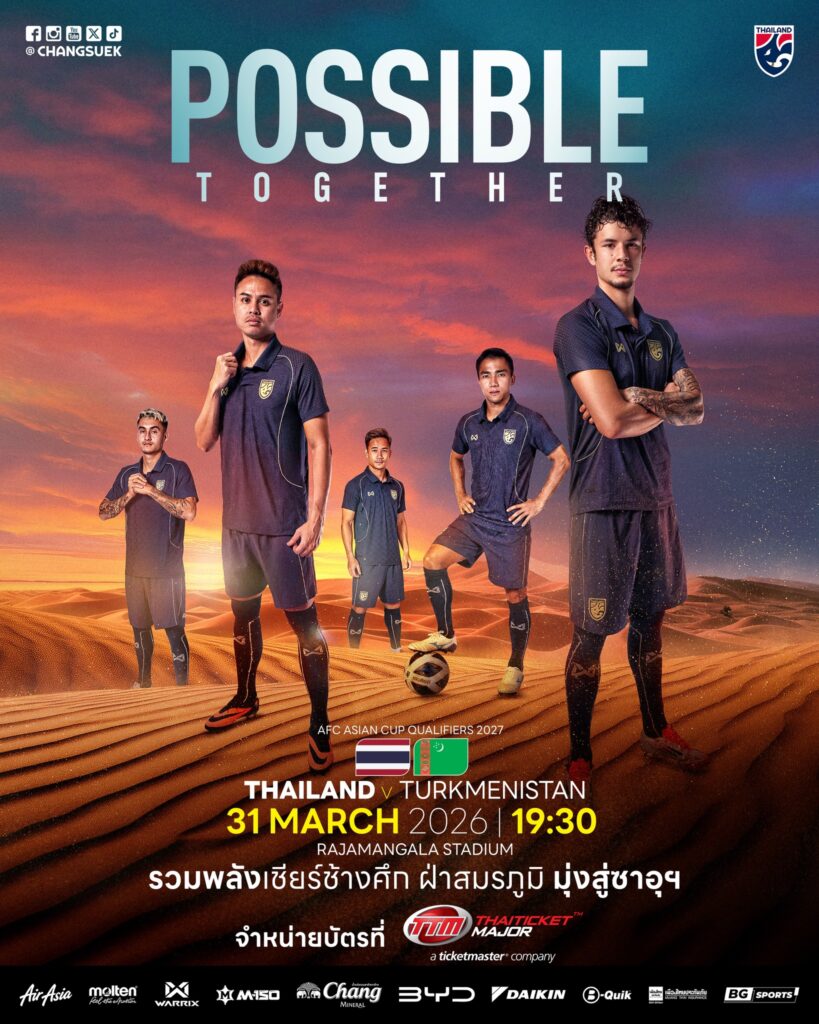 แฟนบอลที่คิดว่า “เดี๋ยวค่อยดูไฮไลท์ก็ได้” บอกเลย…นัดนี้ควรอยู่ในลิสต์ “ต้องไปอยู่ในสนาม” เพราะนี่คือเกม เอเชียน คัพ 2027 รอบคัดเลือก ที่ทุกแต้มมีน้ำหนักเหมือนแบกทั้งประเทศไว้บนบ่า ช้างศึกมีคิวเปิดบ้านเจอกับเติร์กเมนิสถาน ที่ ราชมังคลากีฬาสถาน วันอังคารที่ 31 มีนาคม 2569 เวลา 19.30 น.