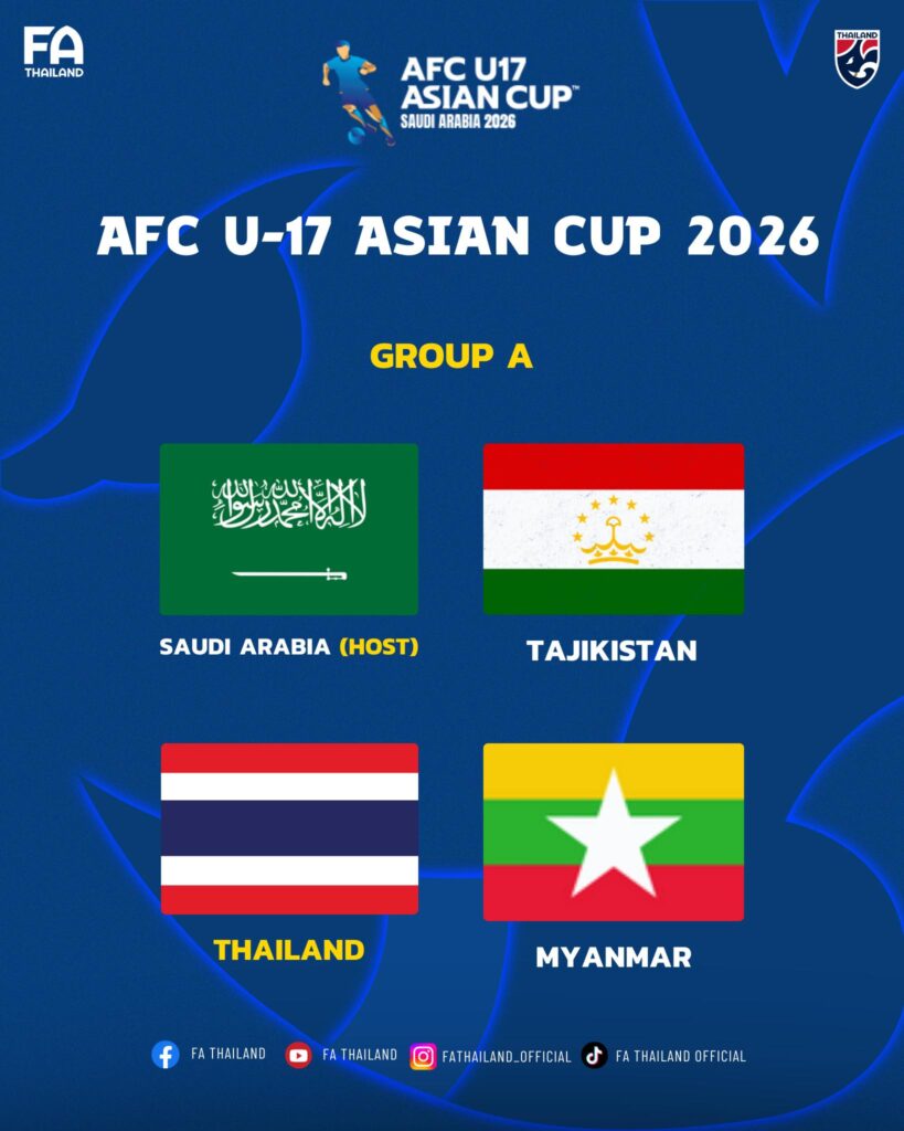 ผลจับสลากออกมาชัดเจนว่า ทีมชาติไทย U17 ถูกจัดให้อยู่ “กลุ่ม A” ร่วมกับ ซาอุดีอาระเบีย (เจ้าภาพ), ทาจิกิสถาน และเมียนมา ในศึก AFC U-17 Asian Cup 2026 รอบสุดท้าย ที่จะฟาดแข้งกันช่วงเดือนพฤษภาคมนี้ บอกเลยว่านี่ไม่ใช่สายที่เดินเล่นแล้วเข้ารอบได้ เพราะมีทั้งเจ้าภาพที่ได้แรงเชียร์เต็มสนาม และอีกสองทีมที่สไตล์บอลคนละแบบให้ไทยต้องแก้โจทย์รายนัดแบบละเอียดทุกฝีก้าว