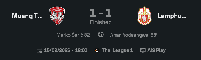 - หมดเวลา 90 นาที เมืองทอง 1-1 ลำพูน แบ่งแต้มแต่แบ่งความเครียดกันคนละครึ่ง
