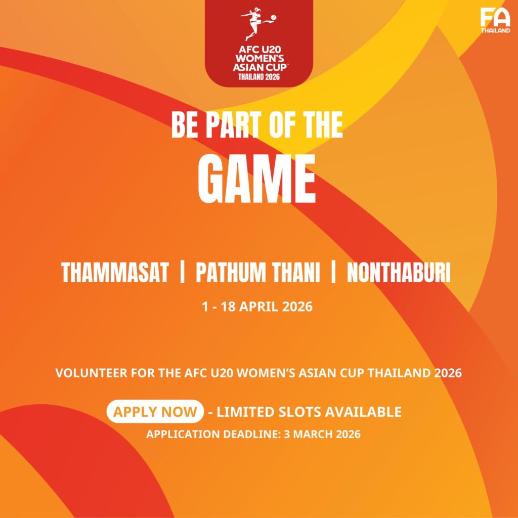 สมาคมกีฬาฟุตบอลแห่งประเทศไทย ในพระบรมราชูปถัมภ์ เปิดรับสมัคร “อาสาสมัคร” เพื่อร่วมเป็นส่วนหนึ่งของการแข่งขันฟุตบอลหญิงรุ่นอายุไม่เกิน 20 ปี ชิงแชมป์เอเชีย รอบสุดท้าย รายการ AFC U20 Women’s Asian Cup Thailand 2026 ซึ่งประเทศไทยจะเป็นเจ้าภาพจัดการแข่งขัน ระหว่างวันที่ 1-18 เมษายน 2569