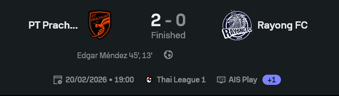 ถ้าดูแค่เปอร์เซ็นต์บอล ระยองเหมือนจะ “คุมจังหวะ” ได้มากกว่า แต่ฟุตบอลมันไม่ใช่เกมสะสมการจ่ายบอลให้สวยงาม เกมนี้ประจวบชนะด้วยความชัดเจนในพื้นที่สุดท้าย—จังหวะเข้าทำคมกว่า ตัดสินใจเร็วกว่า และที่สำคัญมี “ตัวจบสกอร์” แบบเมนเดซที่พร้อมลงโทษทันทีเมื่ออีกฝั่งเผลอ ส่วนระยองเหมือนเล่นดีในทางผ่านบอล แต่พอถึงหน้ากรอบ… กลายเป็นบุกแบบมีมารยาทเกินไป ไม่ได้บีบให้เจ้าบ้านปั่นป่วนพอ สุดท้ายเลยจบที่ครองบอลสวย แต่แต้มไม่เข้ากระเป๋า