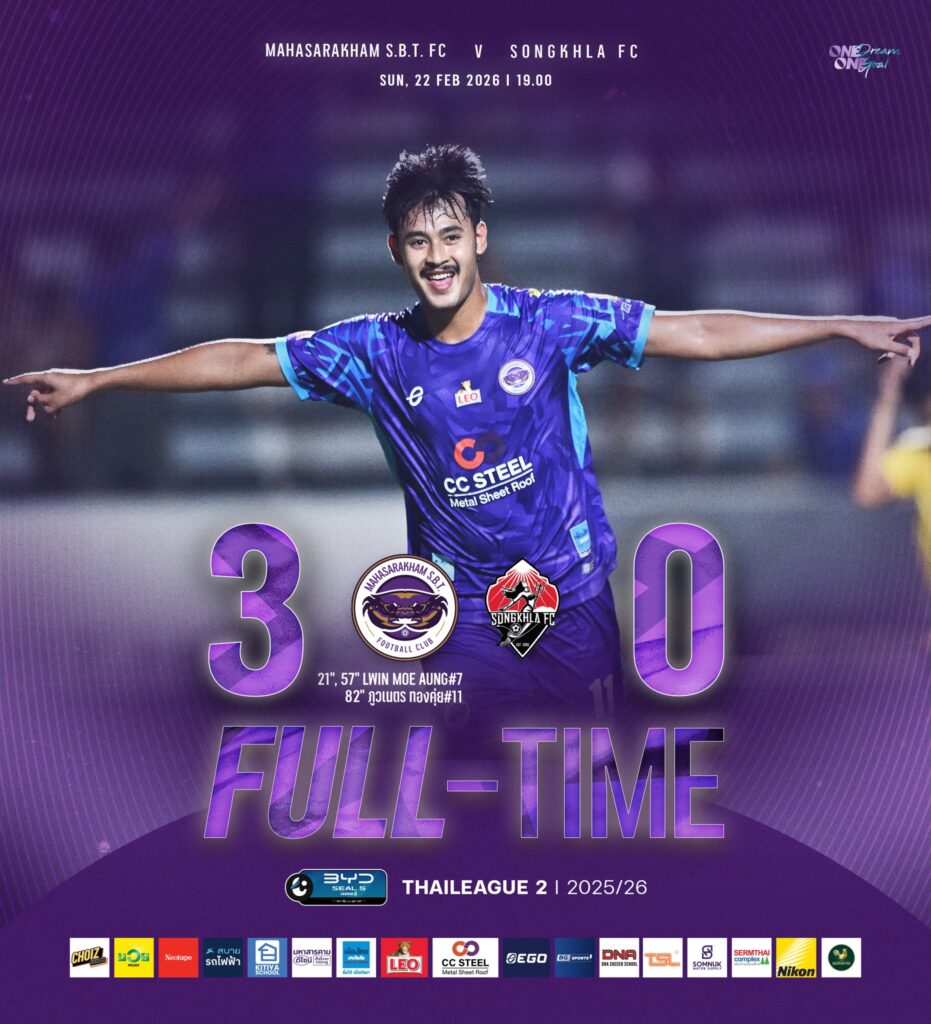 มหาสารคาม เอสบีที เอฟซี เปิดบ้านอัด สงขลา เอฟซี 3-0 ในศึก ไทยลีก 2 ฤดูกาล 2025/26 นัดที่ 26 เมื่อวันที่ 22 กุมภาพันธ์ ที่สนามกีฬากลางจังหวัดมหาสารคาม ผลการแข่งขันนัดนี้ไม่ใช่แค่สามแต้มธรรมดา แต่มันคือการส่งสัญญาณว่า “ปูม่วงมหากาฬ” กำลังจับจังหวะได้ถูกเวลาในโค้งตัดสินฤดูกาล