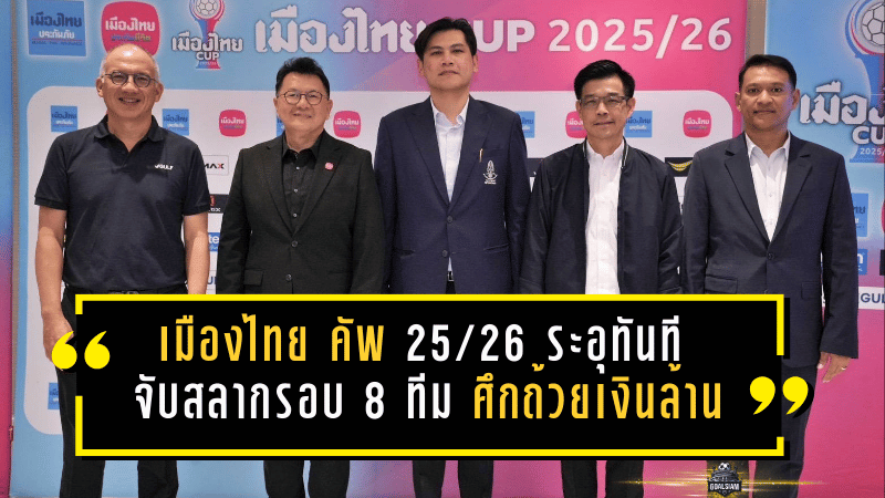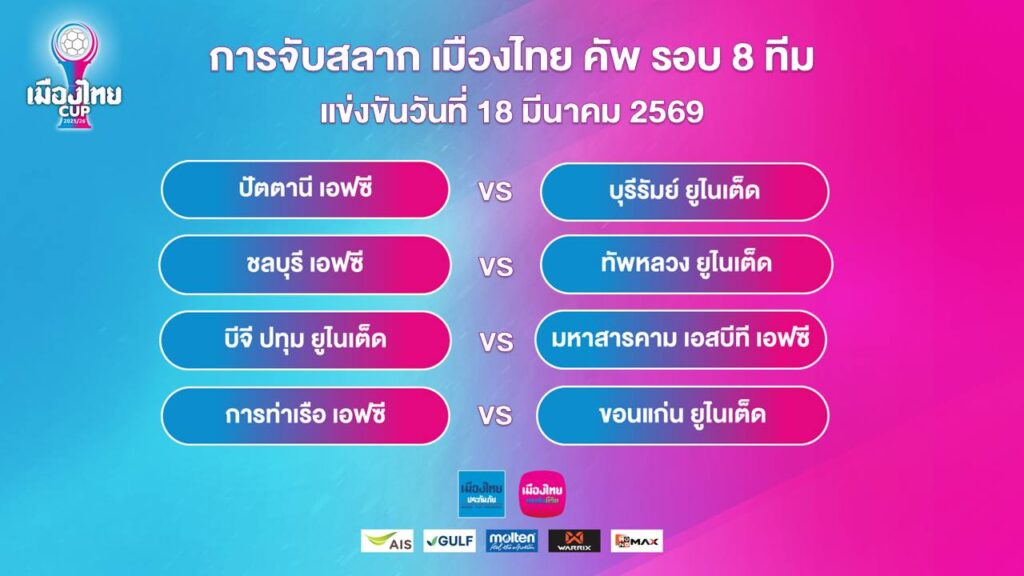 สมาคมกีฬาฟุตบอลแห่งประเทศไทยฯ เปิดผล จับสลาก การแข่งขัน เมืองไทย คัพ ฤดูกาล 2025/26 ในรอบ 8 ทีมสุดท้าย (รอบก่อนรองชนะเลิศ) ซึ่งแค่เห็นคู่ประกบก็พอเดาได้เลยว่า “ถ้วยนี้ไม่มีคำว่างานง่าย” เพราะหลายทีมต่างลีกโคจรมาชนกันแบบเลี่ยงไม่ได้ โดยเฉพาะแชมป์เก่าอย่าง บุรีรัมย์ ยูไนเต็ด ที่ต้องออกไปเยือน ปัตตานี เอฟซี ในเกมที่ความกดดันมาเต็มตั้งแต่นกหวีดแรก