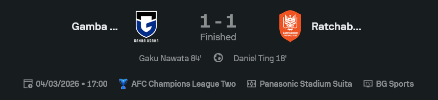 ศึกเอเอฟซี แชมเปี้ยนส์ ลีก ทู 2025/26 คู่นี้ ผลบอลสด ออกมาที่กัมบะ โอซาก้า เปิดบ้านเจ๊า ราชบุรี เอฟซี 1-1 เกมทั้งเกมเหมือนหนังคนละม้วน กัมบะครองบอลบุกยับ แต่โดนราชบุรีสวนทีเดียวคม ๆ ก่อนจะมาตามทวงคืนเอาท้ายเกมแบบไม่ให้แฟนเจ้าถิ่นเสียหน้าเกินไป