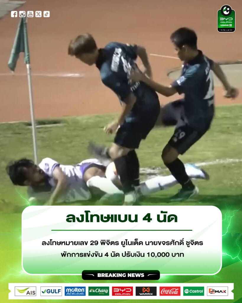 วงการ ไทยลีก 3 มีประเด็นร้อนขึ้นมาทันที หลังมีการเปิดเผยบทลงโทษของ ขจรศักดิ์ ชูจิตร อดีตนักเตะของ พิจิตร ยูไนเต็ด 2025 จากเหตุการณ์เล่นรุนแรงใส่คู่แข่งในเกมที่พบกับ อุตรดิตถ์ เอฟซี โดยบทสรุปคือเจ้าตัวถูกสั่งพักการแข่งขันและห้ามเข้าสนาม 4 นัด พร้อมปรับเงิน 10,000 บาท จากความผิดฐานทำร้ายร่างกายคู่แข่งขันภายในเกมเดียวกันอย่างชัดเจน