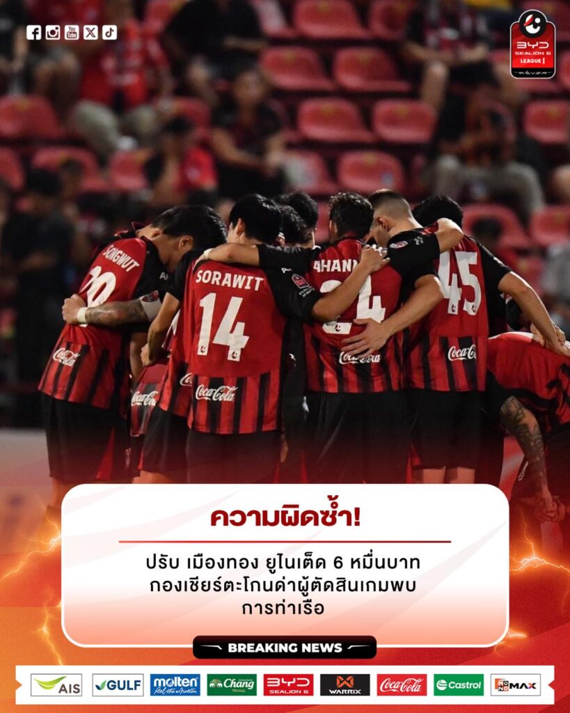 เมืองทอง ยูไนเต็ด ต้องรับบทลงโทษทางวินัยอีกครั้ง หลังเกิดเหตุแฟนบอลในสนามตะโกนด่าผู้ตัดสินอย่างพร้อมเพรียง ระหว่างเกม BYD SEALION 6 LEAGUE 1 ฤดูกาล 2025/26 นัดที่เปิดบ้านพบ การท่าเรือ เอฟซี ซึ่งเป็นเกมที่บรรยากาศตึงตั้งแต่ช่วงท้ายจนกลายเป็นประเด็นตามมา สนามทันทีหลังจบแมตช์